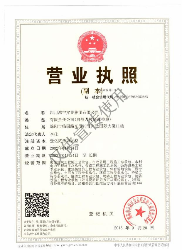四川鸿宇实业集团有限公司始建于2002年4月,位于“中国科技城”——四川绵阳,注册资本1.2亿元。职工总数400余人,其中各类专业技术人员、中高级职称300余人。 鸿宇秉承“诚信、拓展、合作、奉献”企业精神,坚持“一业为主、多元发展、创新务实、内联外拓”的经营理念,建立了科学的管理体制和运行机制,并形成了具有鸿宇特色的管理模式和企业文化。